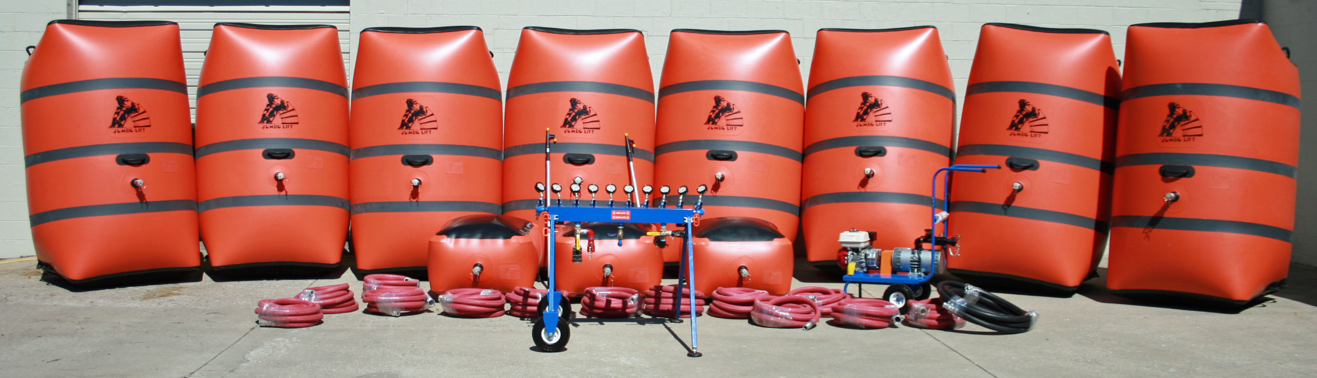 Lift capacity 160,000lbs. This set includes: 3- Starter Turbo Cushions. 8- Jumbo Turbo Cushions. 1- Air Compressor Cart Assembly with 5hp Honda Engine. 1- 10 Port Valve Bank with overload protection. 10- Dust Plugs. 8- Sotrage Carabiners. 1- 1-1/4" x 30' Suction Hose. 1- 1-1/4" x 30' Pressure Hose. 13- 30' Turbo Hoses. 2- Extending Placing Poles. 10- Operator Badges. 1- Repair Kit. |