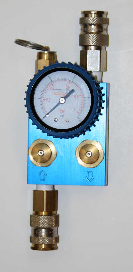 Low pressure push button deadman control with 0- 30psi. / 2 bar gauge with built in 9psi./ .62 bar relief valve. Used to control pressurizing and deflation of low pressure bags. Comes standard with .25 in. / 6mm inlet (air source) fitting and .75 in./ 1.88 cm outlet (to airbag or cushion) fitting, other styles or configuration available upon request.